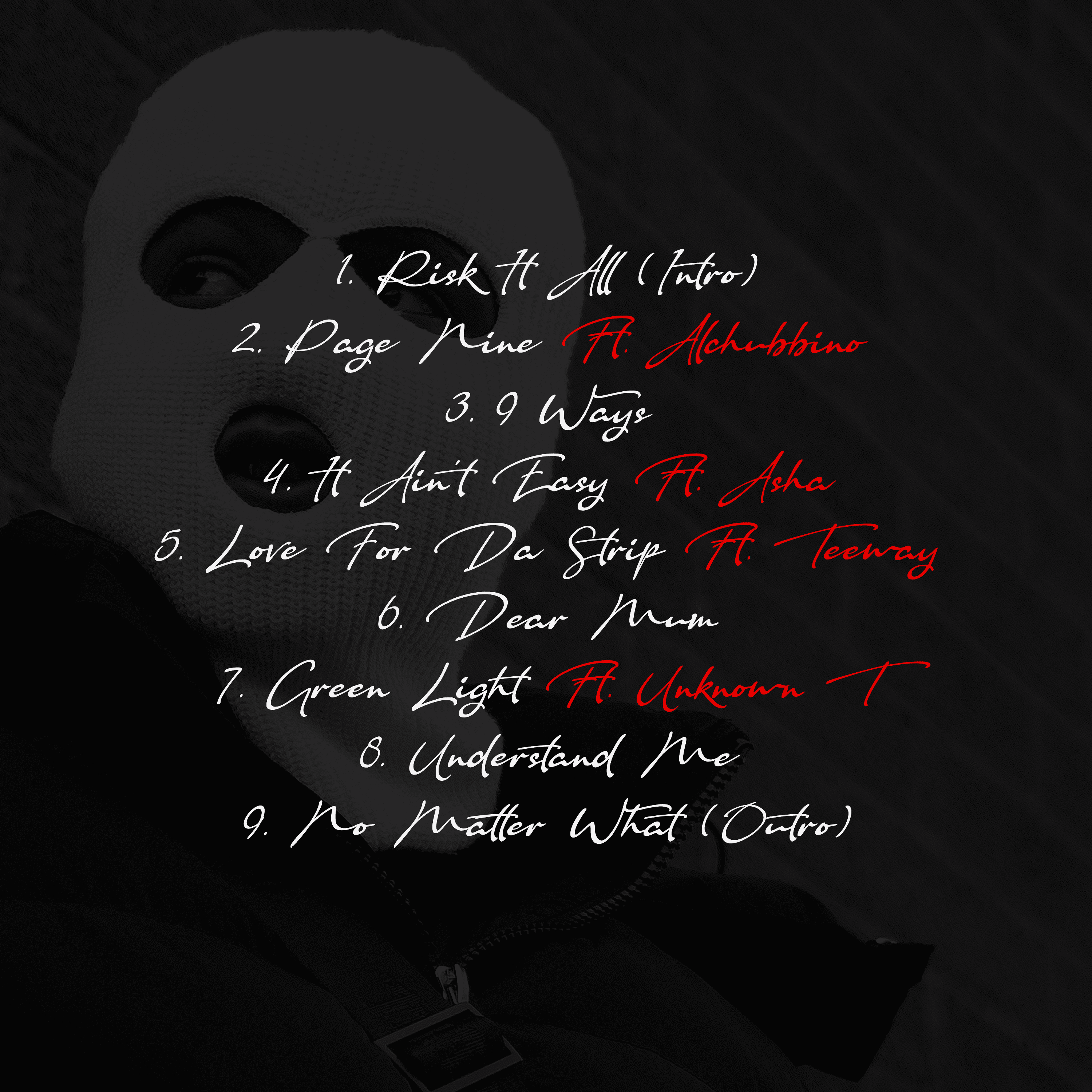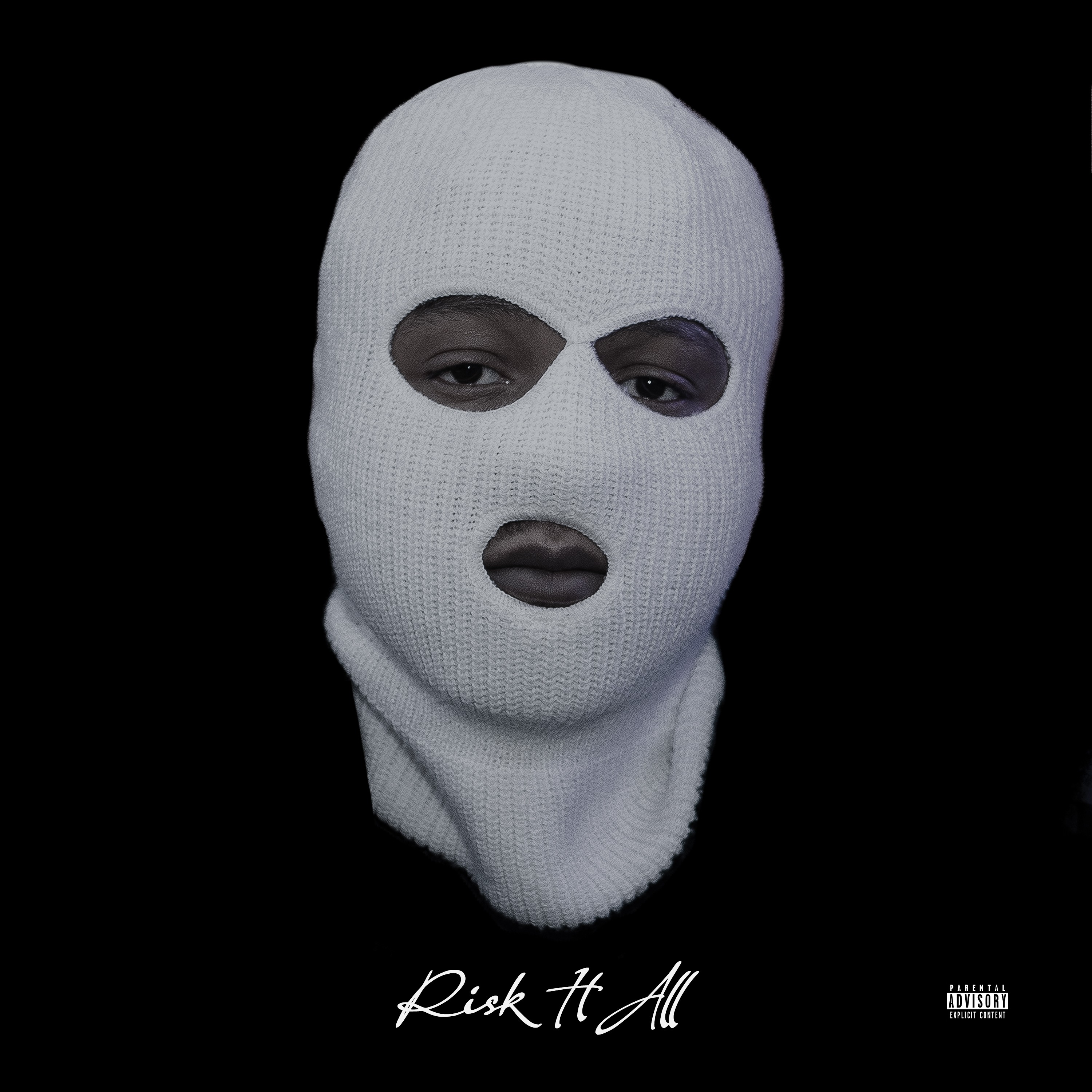 For Risk It All, we led the direction for the project, working closely with the artist and photographer to develop the front and back cover artwork. The concept was built around the EP title, using the white balaclava as the central visual. The front artwork focuses heavily on the balaclava which the artist is well known for within the music scene, making it the focal point of the cover. As this was his first project, the aim was to establish a strong visual identity and brand him clearly with the mask from the outset. The typography was kept consistent with a handwritten, cursive style. On the back cover, we kept the same typography paired with a secondary image subtly faded into the background to keep the overall look cohesive. The project went on to generate over 10 million streams within a few months, highlighting the impact and reach of the release.