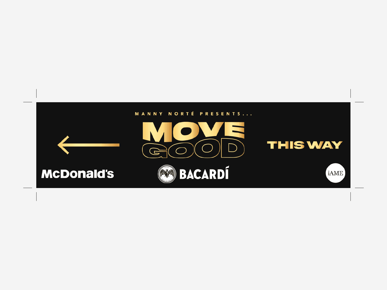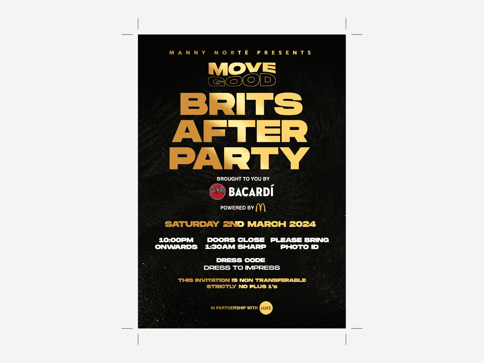 For the Move Good: BRITs After Party, we created a bold event flyer and a set of directional signages used throughout the venue. The aim was to keep the visual language sharp, premium and instantly readable in a fast-paced nightlife environment. The black and gold palette paired with strong typography aligned with the event’s upscale positioning, while sponsor integration for Bacardí, McDonald’s and Manny Norté was balanced carefully to keep the design cohesive. These assets formed the foundation of the event’s identity and helped guide guests from arrival to entry.