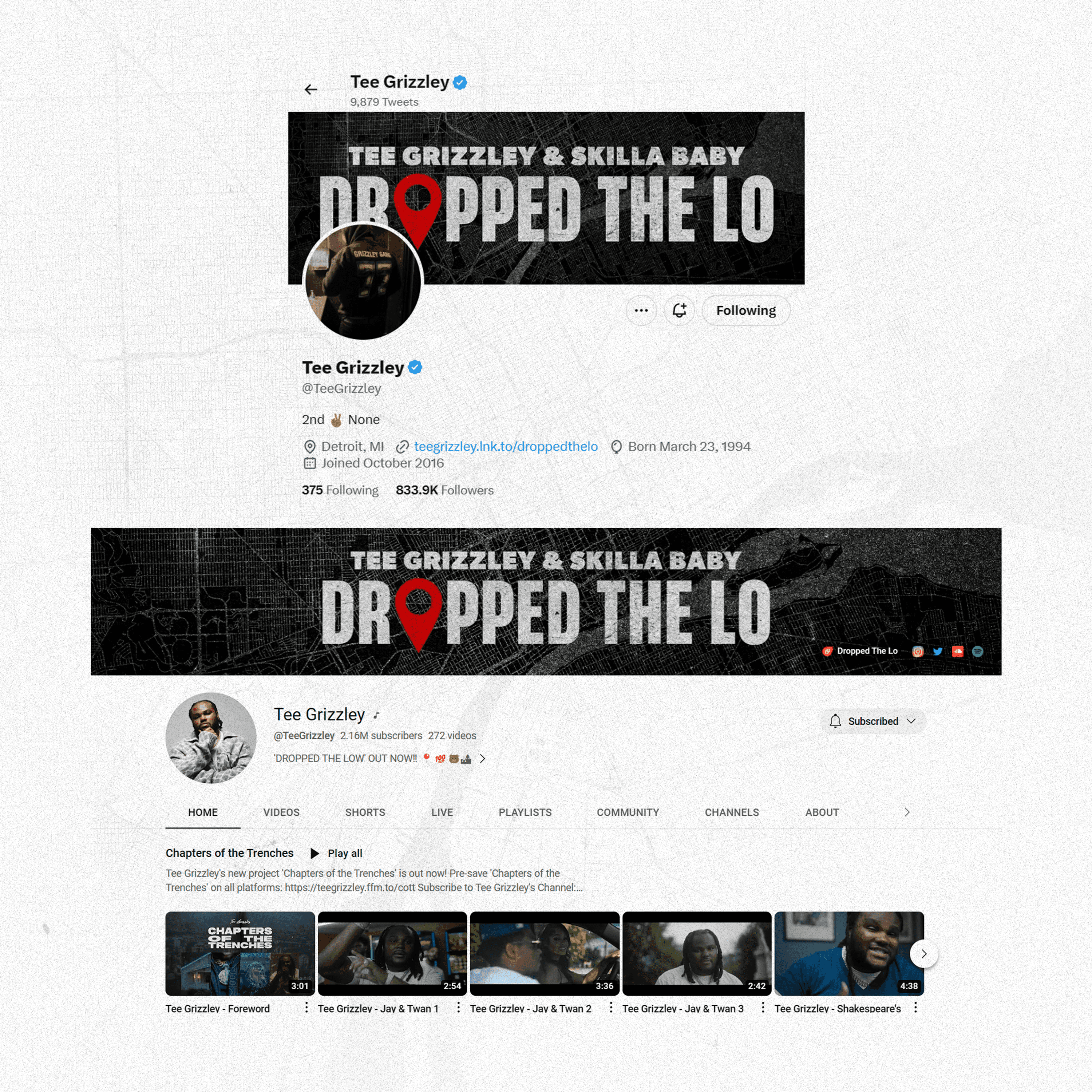 For Tee Grizzley and Skilla Baby’s single “Dropped The Lo,” we designed the official cover art along with a full suite of social media assets used across Instagram, TikTok, YouTube banners and promotional posts. The visual direction centred around a dark, textured map background paired with a bold typographic layout and the red location marker, creating a clear narrative link to the concept of “dropping the location.” The assets were built to translate seamlessly across multiple formats ensuring consistency throughout the entire rollout and giving the release a strong visual identity across platforms.
